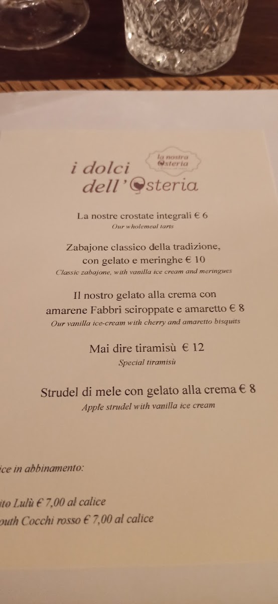 Desserts at La Nostra Osteria are simply divine. The Zabaione Al Marsala Con Gelato E Meringhe is a light yet indulgent treat, combining a creamy Marsala custard with refreshing gelato and crunchy meringue. Le Crostate dell'Osteria and Mousse Al Cioccolato are both delightful, with the crostata offering a rustic fruit-filled tart and the mousse presenting a rich chocolate experience.